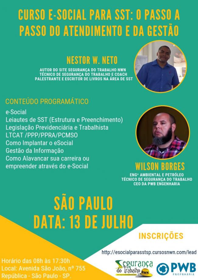 Em julho estarei junto com o Nestor W. Neto, agora em São Paulo, para uma edição especial do Curso e-Social para SST: O passo a passo do atendimento e da gestão. Não fique de fora dessa, acesse o link e vem com a gente!!! www.pwbengenharia.com.br/agenda